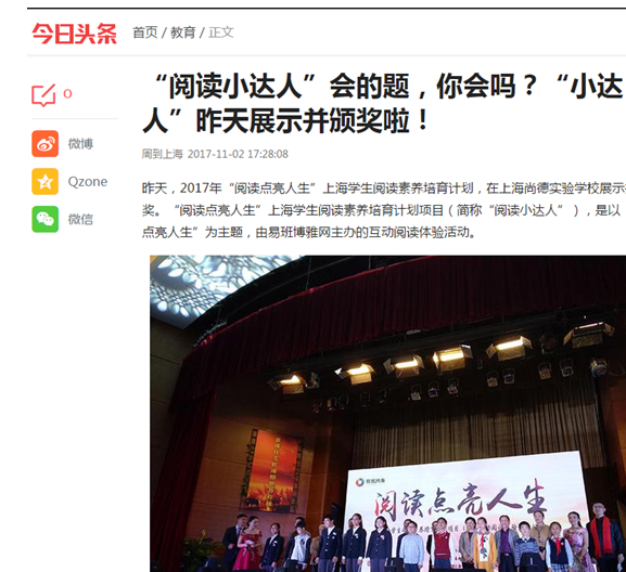 2017年,“阅读点亮人生”上海学生阅读素养培育计划项目(网络互动阅读体验),简称“阅读小达人”,是以“阅读点亮人生”为主题,在上海市语言文字工作委员会和上海市教育委员会指导下,由易班博雅网主办的市级网络互动阅读体验活动。从4月起上线的网络答题页面总共吸引了超过100000人次进行答题。